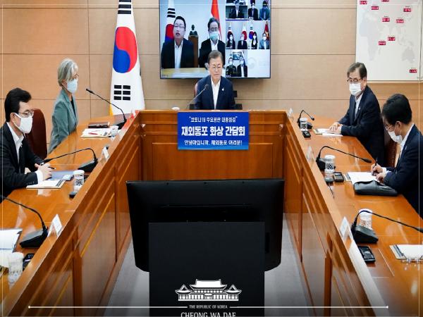 문재인 대통령은 화상으로 만난 재외동포들에게 "지난 3월 한국이 코로나로 어려움을 겪을 때 재외동포 여러분의 따뜻한 마음이 고국에 큰 힘이 되었다"며 안부 인사를 전했다. 아울러 재외동포들이 성금과 마스크 등을 보낸 사례를 언급하며 "모두 자랑스러운 대한민국의 민간 외교관이고, 여러분이 실천한 연대와 협력의 정신이 우리 국민들에게는 물론 세계인들에게도 희망이 되고 있다"고 설명했다.