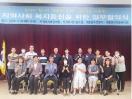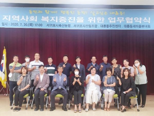 대륜동(동장 강현수)과 대륜동새마을부녀회(회장 현경희), 서귀포시축산업협동조합(조합장 김용관), 서귀포시산림조합(조합장 오형욱)은 지난 30일 동 주민센터 3층 대회의실에서 4개 기관장과 관계자 등 20여명이 참석한 가운데 소외계층의 복지증진과 사회공헌활성화 등 지역복지증진을 위해 기관 간 업무협약을 체결하였다.