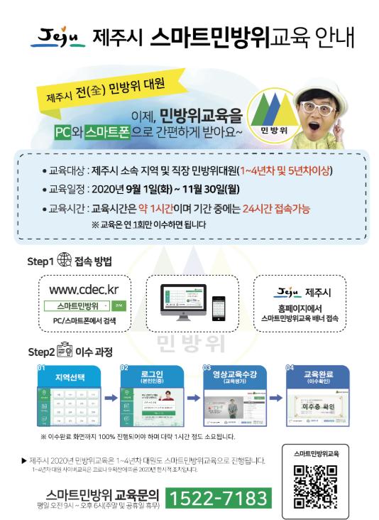 민방위대원은 9. 1.(화) ~ 11. 30.(월) 기간 중 제주시청 홈페이지나 인터넷 포털사이트를 통해 “스마트민방위교육(www.cdec.kr)”에 접속하여 본인인증을 거쳐 1시간의 교육을 받으면 된다.
