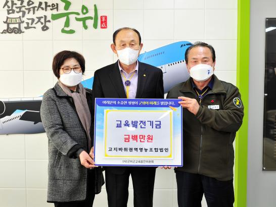 고지바위권역영농조합법인 사공록 대표는 지난 27일 군위군청을 방문하여 지역의 교육발전과 인재양성을 위해 써달라며 교육발전기금 100만 원을 기탁했다.